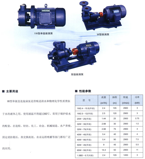 主要用途:W型單級直連旋渦泵是供吸送清水和物理化學(xué)性質(zhì)類似于水的液體之用,使用液溫不得超過60℃,常用于鍋爐給水的配套,在造船、輕紡、化工、冶金、機械制造、水產(chǎn)養(yǎng)殖、固定消防穩(wěn)壓、熱交換機組、農(nóng)業(yè)遠(yuǎn)程噴灌等部門都有廣泛的應(yīng)用。